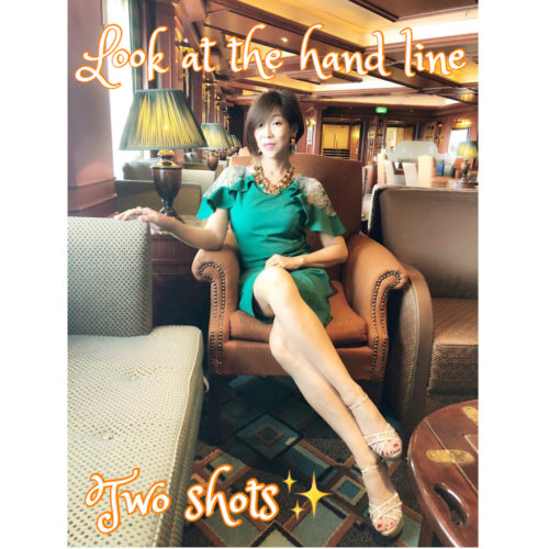 ❷HAND・・手の位置を自然と隣の椅子にわざと少し体より前に置く←さらに眼の錯覚で体と脚が細くみえる。
